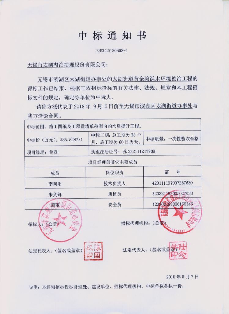 8月7日,完美体育在线(中国)唯一官方网站在太湖街道黄金湾浜水环境整治工程投标阶段,凭借良好的市场信誉,成熟完善的投标方案,从众多竞争对手中脱颖而出,成功中标该项目,中标价585万元。